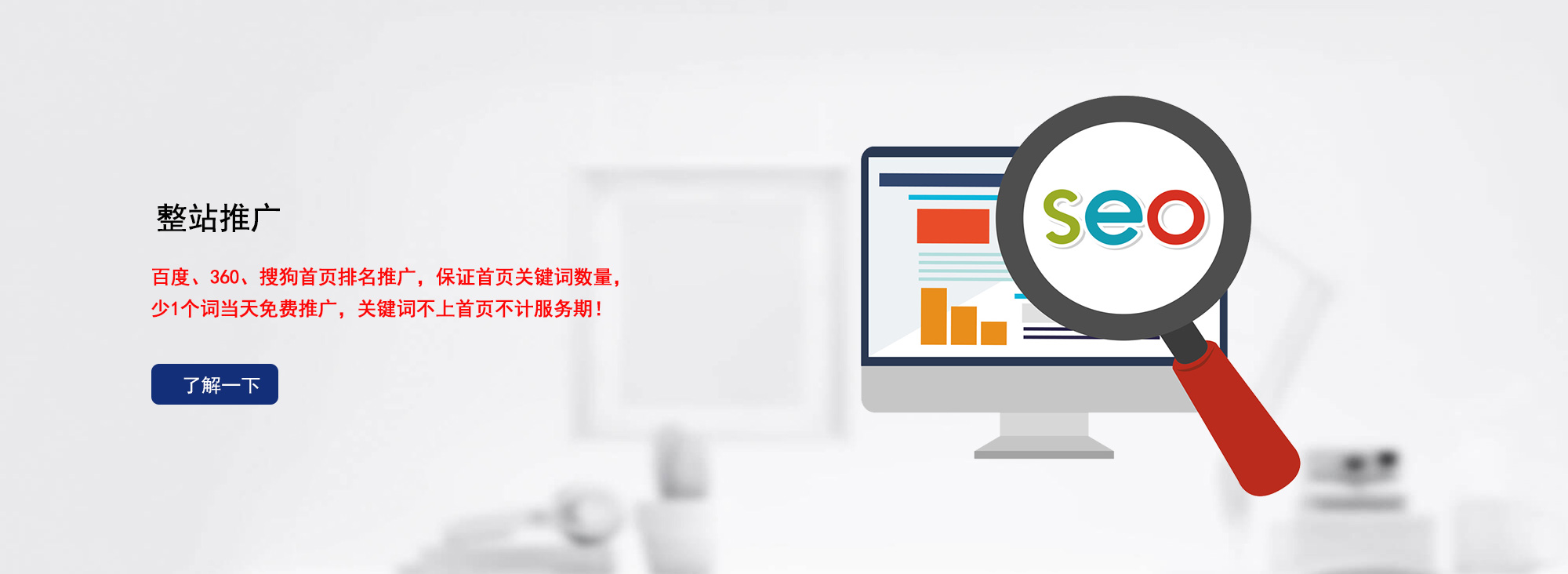 通過豐富的精準的關鍵詞,運用SEO技術,在短時間內使用戶的網站在國內主流搜索引擎取得大量關鍵詞的穩定排名……